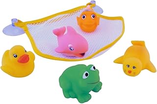 Bieco 11000105 - Badewannenspielzeug mit 5 Tieren, Wasserspielzeug im Netz, Badewannennetz mit Wal, Robbe, Frosch, Ente und Fisch für Kinder ab 12 Monaten zum Planschen und Greifen, bunt